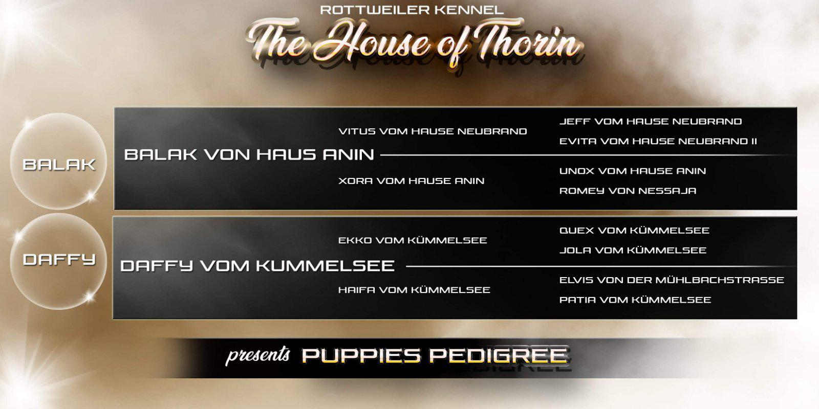 Odgajivacmica rotvajlera The House of Thorin iz Stare Pazove predstavlja vrhunsko 100% ADRK leglo rotvajlera ostenjeno 29.11.2019 god, 4 zenke slobodne za prodaju od vrhunskih roditelja. Zenke su stare 2 meseca, primile prvu vakcinu a uskoro i drugu, ociscene od parazita. Za sve izradjeni rodovnici.