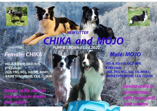 Majka Chika je u našem vlasništvu, poreklo vodi od izuzetne radne linije. Svakodnevno vodi aktivan život, koji podrazumeva učenje trikove, boravak u prirodi i agility treninge (A0). Ocenjena je odličnom ocenom.