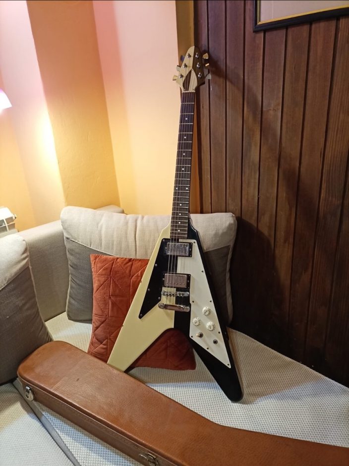 Postaje teško pronaći ovako kvalitetne V-ove – vrlo su precizno napravljeni prema crno-belim Gibson Vs-ima iz 70-ih. Prodajem je sa originalnim koferom. Vrlo lepo stanje, ima nekoliko  ogrebotina na telu od upotrebe, koje ništa ne smetaju, svira i zvuči sjajno.