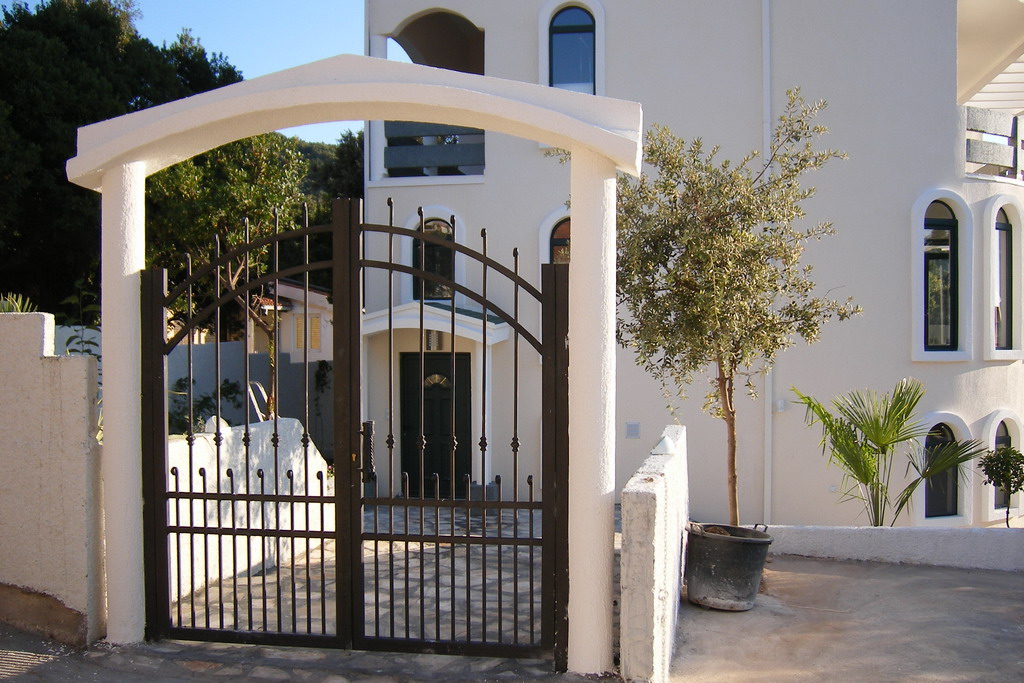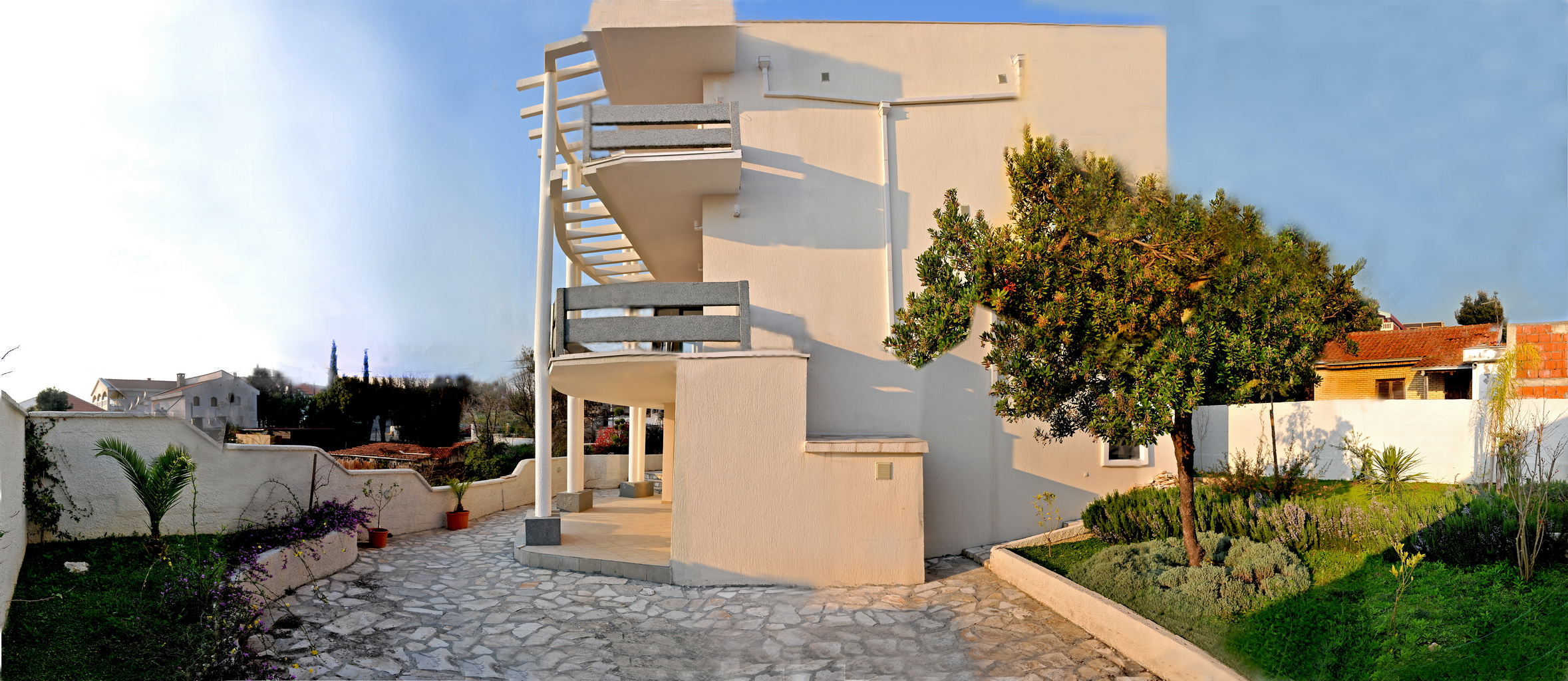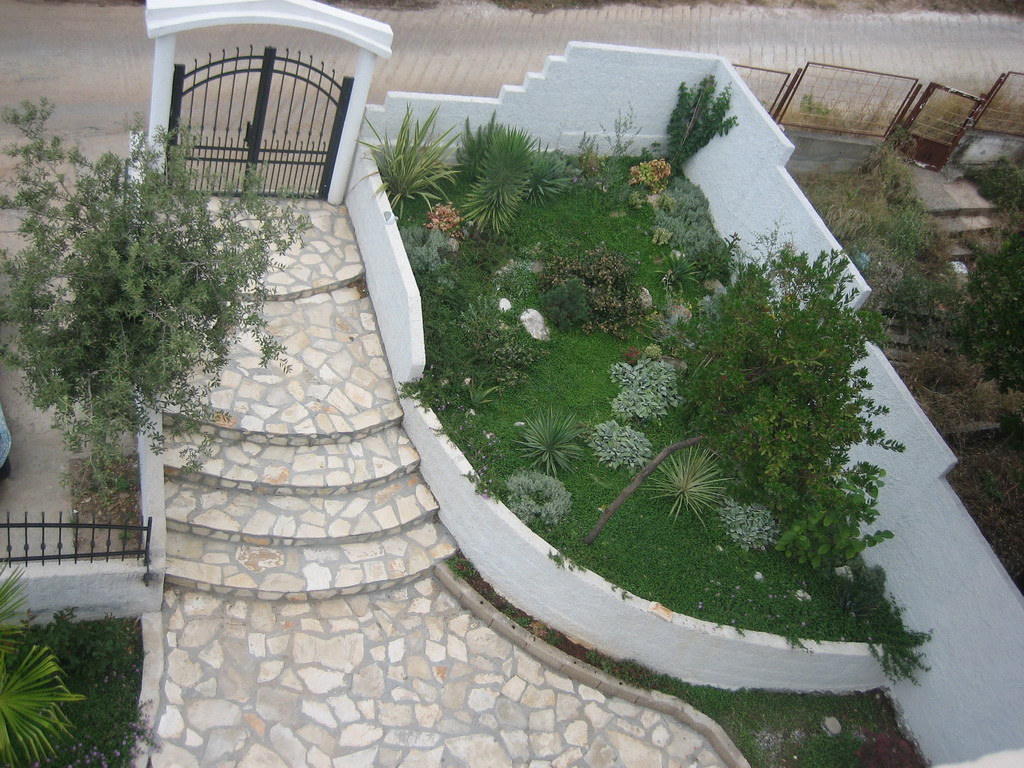 Dvorište površine 500m² popločano je kamenom sa travnatim celinama.U projektovanju je vođeno računa o hortikulturnim celinama, a posebno su birane biljke koje su posađene.