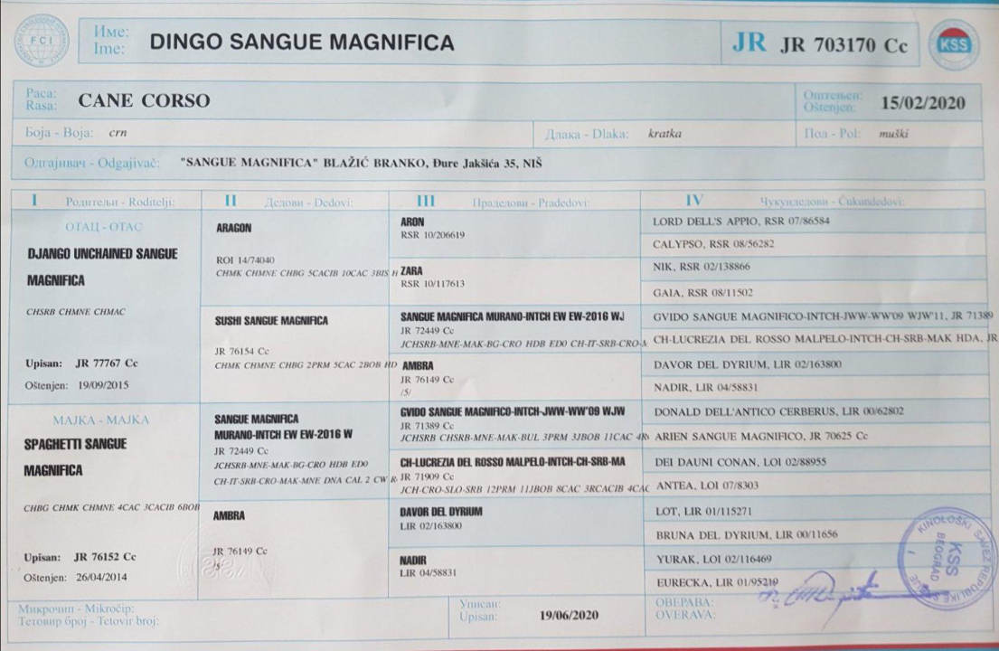 KANE KORSO muzjak Dingo Sanque Magnifica spreman za PARENJE Pas je star 16 meseci i odlicne je krvne linije. Sve o poreklu psa mozete procitati sa slike rodovnika. Cena dogovor…