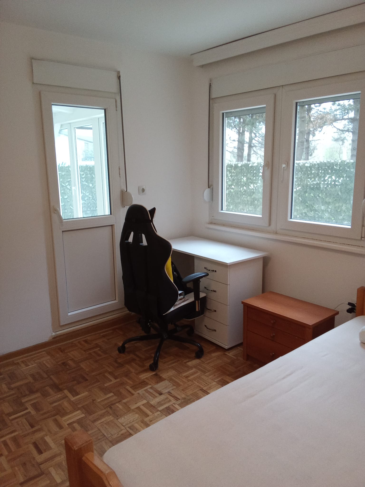 The apartment is located on the high ground floor, on top of garages on the ground floor, with view of neighbouring gardens and yard trees.