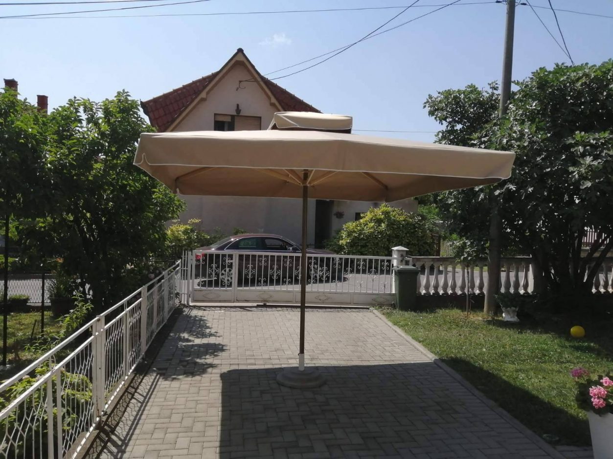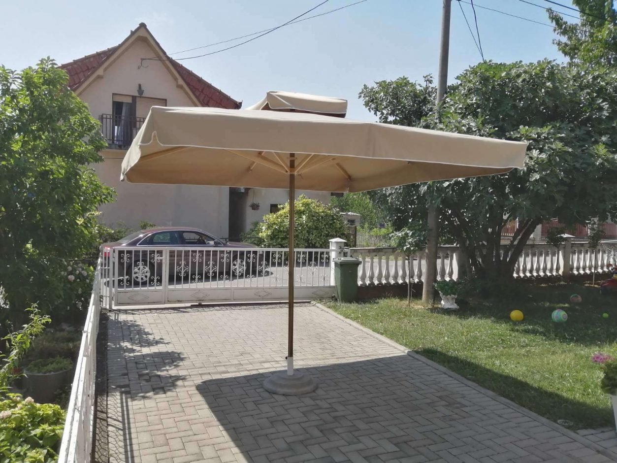 U kompletu je betonsko postolje, cev suncobrana i konstrukcija suncobrana