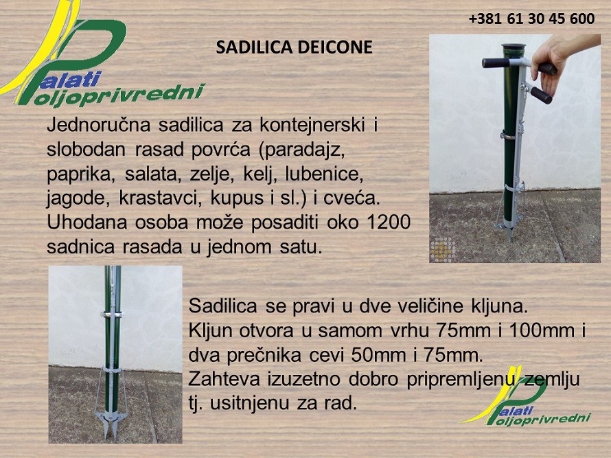 Sadilica Deicone je jednoručna sadilica za kontejnerski i slobodan rasad povrća (paradajz, paprika, salata, zelje, kelj, lubenice, jagode, krastavci, kupus i sl.) i cveća.
