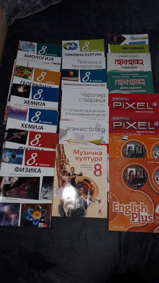 Prodajem komplet udžbenika za 8. razred OŠ 8. Septembar. Udzbenici su po novom programu kupljeni za prethodnu školsku godinu. Cena za komplet 6000 din
